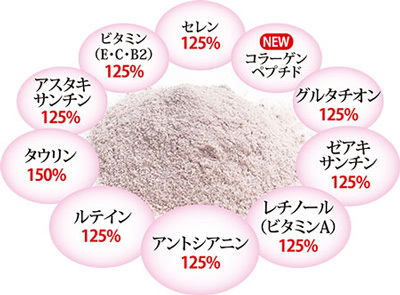 - スキムミルク、デキストリン、チーズ、卵黄、グルコース、加水分解チキンレバーエキス、コラーゲンペプチド、アヤムラサキ、ブルーベリー、タウリン、グルタチオン酵母、スピルリナ、レチノール(ビタミンA)、ビタミンC、ビタミンE、ビタミンB2、ヘマトコッカス褐色藻、セレン酵母