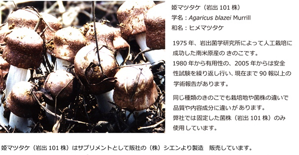 「姫マツタケ」とは?姫マツタケとは岩出菌学研究所が南米ブラジルより取寄せた種菌をもとに1965(昭和40)年より栽培を始め1975(昭和50)年に世界で初めて人工栽培に成功した“きのこ”です。 岩出101株とは安全性と有効性の試験を繰返し行い、岩出菌学研究所により固定種(変異性のない)した菌株です。 岩出菌学研究所の初代所長、岩出亥之助博士は1982(昭和57)年の日本菌学会の会誌『日菌報』において「ヒメマツタケについて」と題した論文を発表し、姫(ヒメ)マツタケが正式和名として認められました。 |